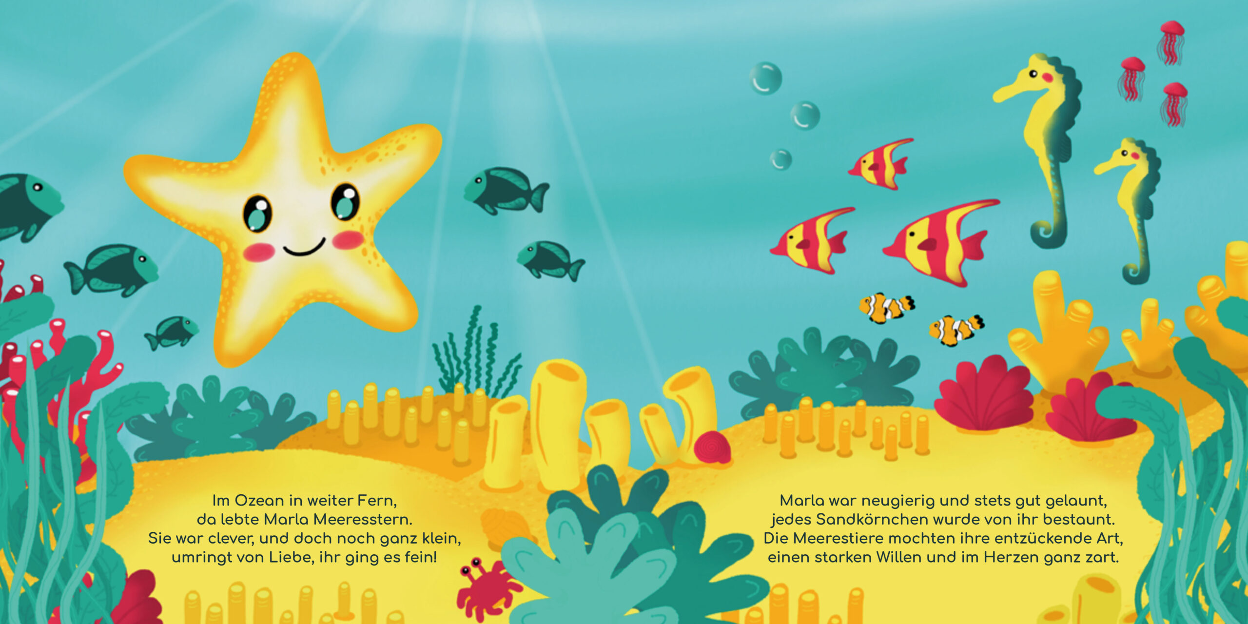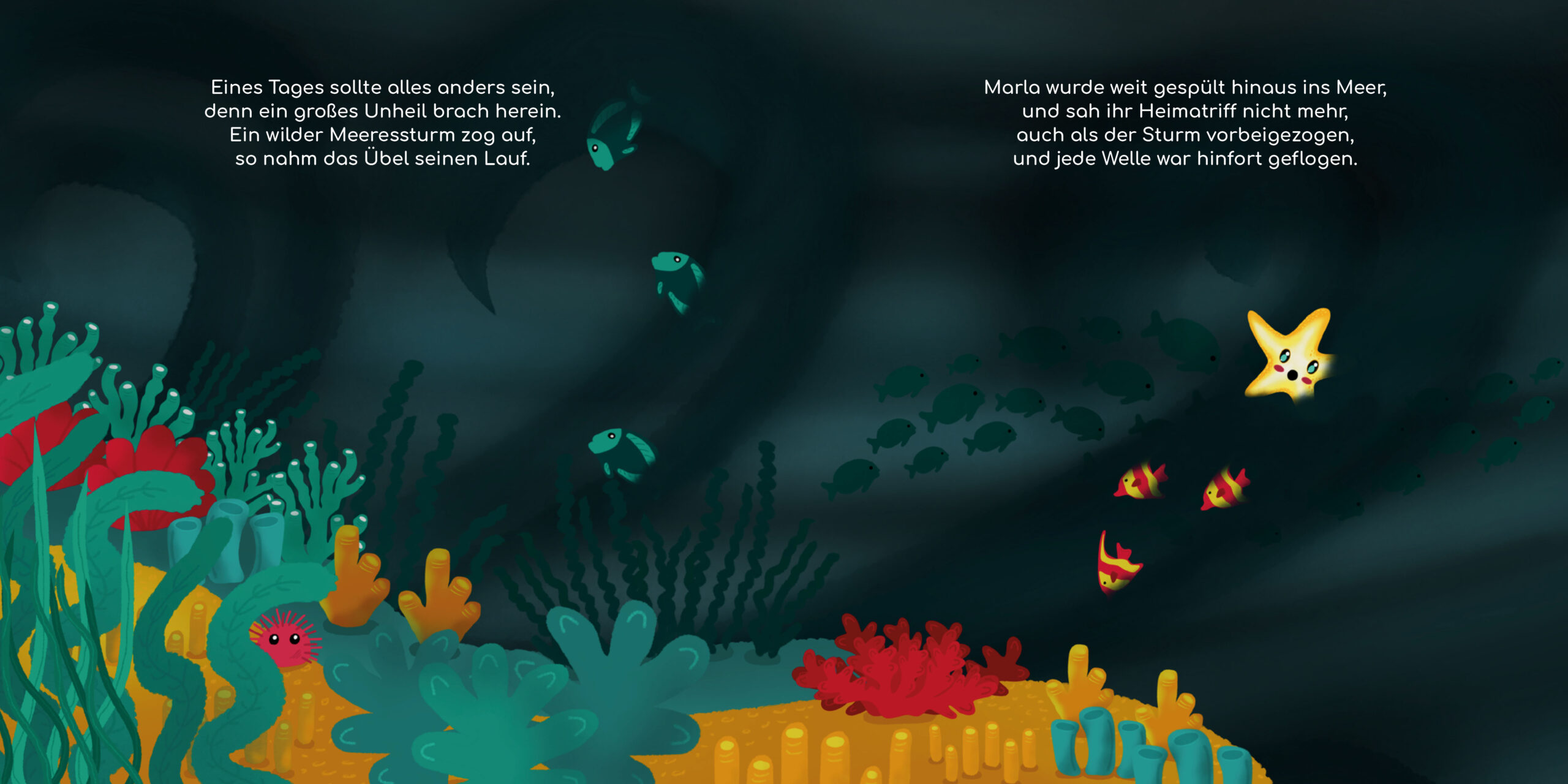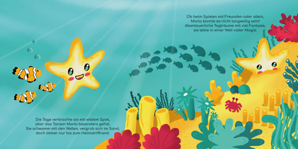 Durch ein Unheil wird der kleine Seestern Marla weit von Zuhause fortgetragen. Auf ihrer Reise durch den Ozean lernt sie viele Meeresbewohner kennen und schließt neue Freundschaften, die ihr bei drohenden Gefahren helfen. Da Marla zwar noch ganz klein, aber mutig ist, stellt sie sich den Herausforderungen und findet heraus, dass es wertvoll ist, eigene Erfahrungen zu sammeln. Nichts ist, wie es scheint, doch eines lernt sie auf ihrer Reise: Zusammen sind Meerestiere stark, welche Bedrohung auch kommen mag!
